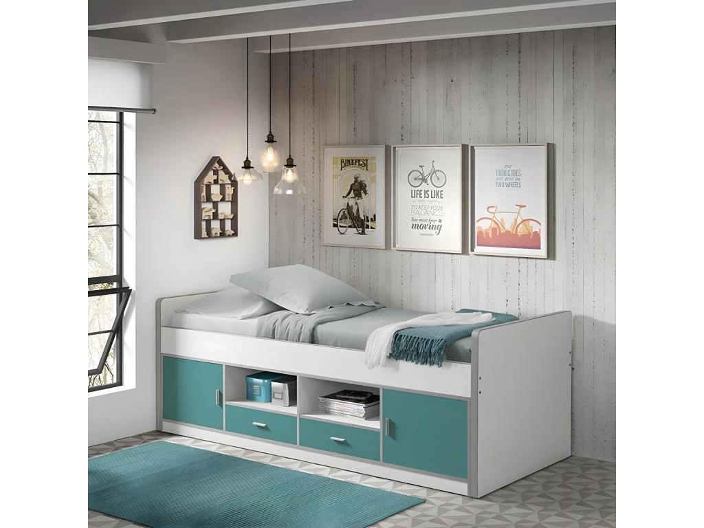 Lit Multi-Rangement 90x200cm Blanc et Turquoise de la gamme Baymax.
