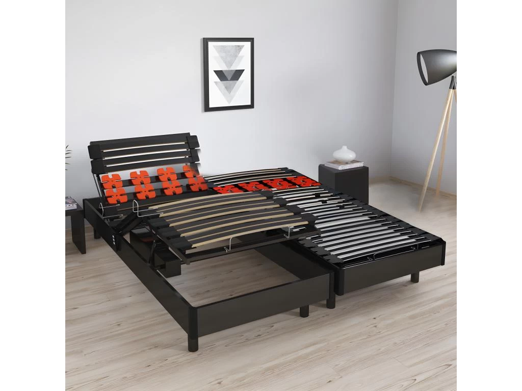 - Personnalisation du couchage : Fonction relevage tête, buste et/ou jambes + Renforts lombaires double-lattes avec curseurs de fermeté + Possibilité de régler la fermeté des plots grâce à des billes conçues pour (incluses).
