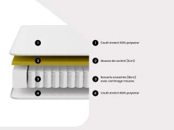 - Âme intérieure (CertiPUR) : 23 cm de mousse Haute Densité de 33 kg/m³ + 4 cm de mousse viscoélastique à mémoire de forme de 60 kg/m³