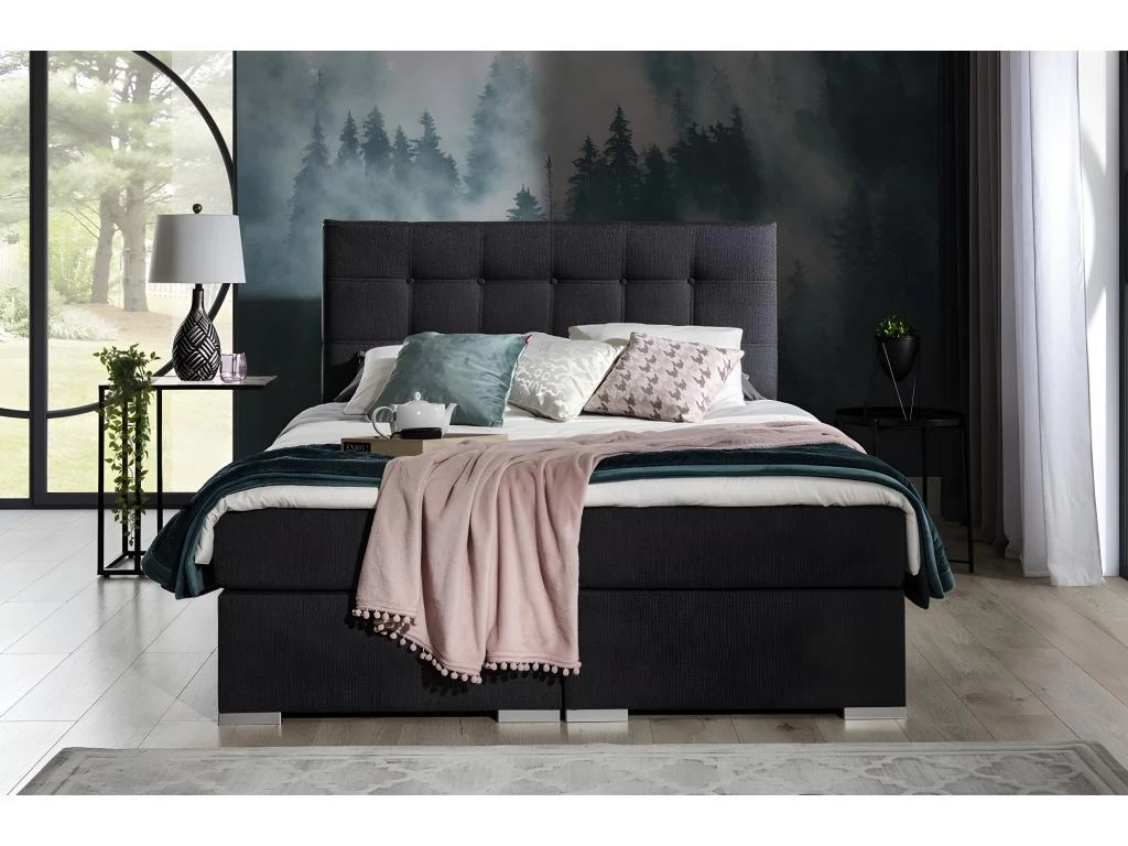 Ce lit de type boxspring, avec un matelas haut et une structure spacieuse et rembourrée. Dispose d’un matelas à ressorts bonnell d’une hauteur de 20 cm, équipé de couches supplémentaires – haut et bas, en mousse T25 souple et d’un surmatelas en mousse T21 d’une épaisseur de 4 cm. Le rembourrage se traduit par un confort maximal pendant le sommeil et un soutien adéquat et stable du corps et un soulagement de la colonne vertébrale. Le lit dispose d’un espace de couchage disponible dans plusieurs dimensions, assurant liberté et confort de repos.