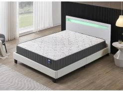 Notre lit vous apportera à coup sûr une touche de modernité dans votre chambre à coucher. Sa tête de lit rembourrée contient un éclairage led, dont vous pourrez modifier à volonté la couleur et les effets de lumière selon vos envies.. Le design élégant de ce lit est également marqué par son revêtement en synthétique. La stabilité du lit est assurée par 4 pieds robustes et renforcée par la présence d’une traverse centrale et de 4 pieds de soutien supplémentaire sous le sommier à lattes, ce dernier est inclus dans la livraison.