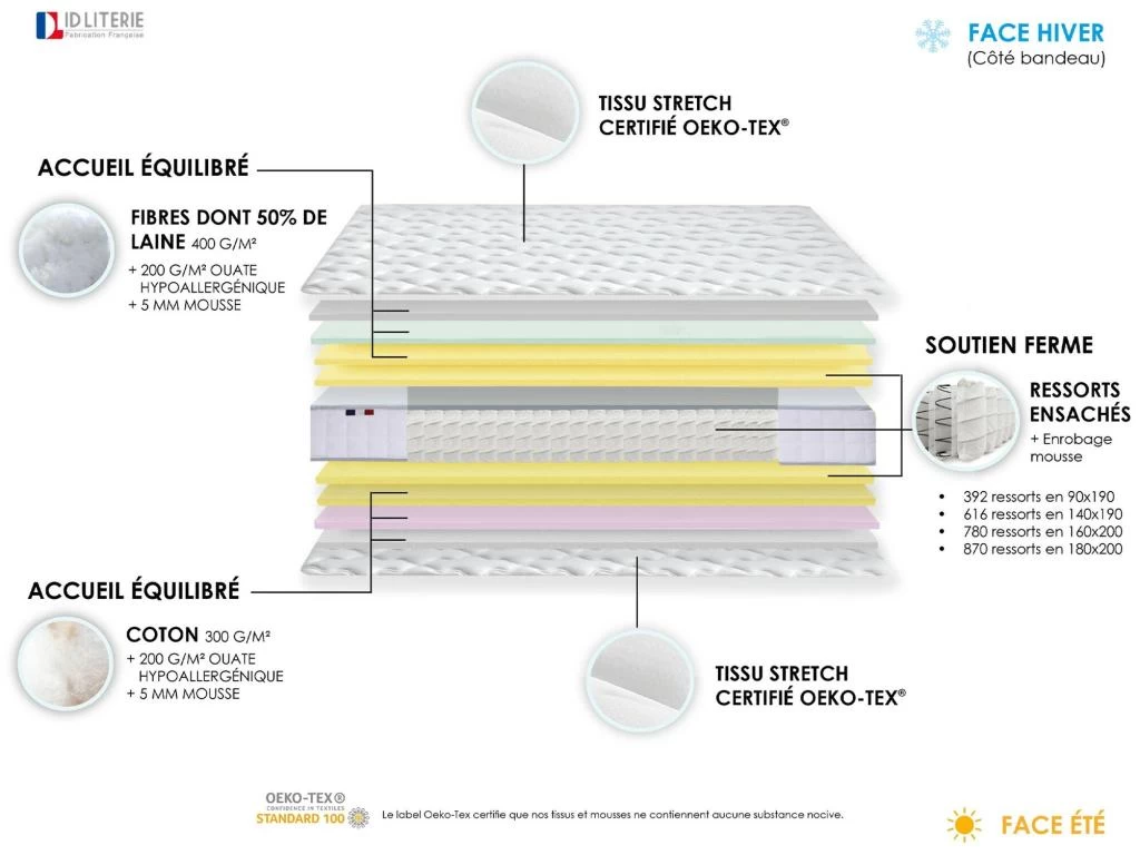 392 ressorts en 90×190 / 616 ressorts en 140×190 / 780 ressorts en 160×200 / 870 ressorts en 180×200