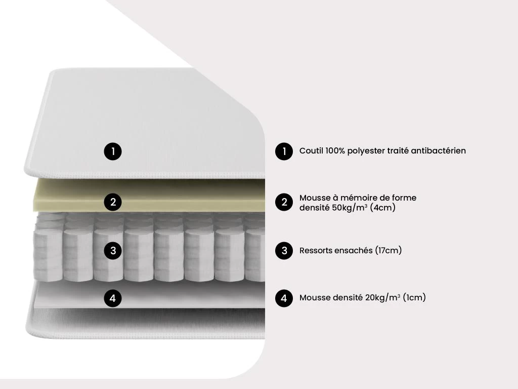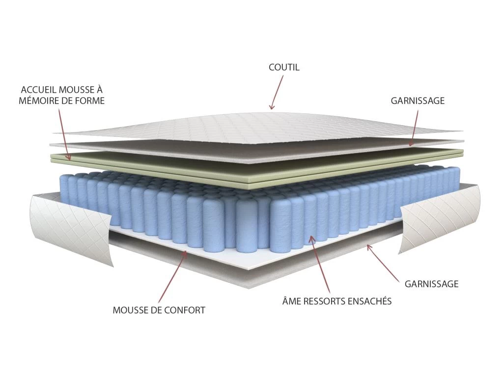 Technique de pointe en matière de ressorts; chaque ressort est emballé dans une enveloppe fermée lui permettant de bouger individuellement et offrant ainsi un soutien point par point très précis et une excellente indépendance de couchage