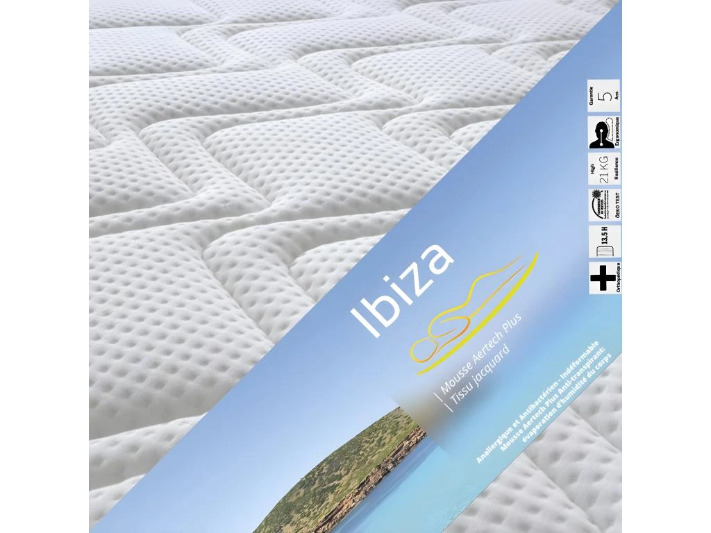 Matelas Ibiza : Mousse Aertech plus H: 11 cm, densité 21 Kg/m3, Housse supérieure et inférieure matelassée fixe composée de Tissu jacquard (70% polyester, 30% polypropylène), Rembourrage Thermoflex B 450 g/m2 (60% Coton, 40% polyester) et Bordage Tissu jacquard (70% polyester, 30% polypropylène). Confort : Soutien ferme, accueil semi ferme – Hauteur 13.5 cm – GARANTIE 5 ANS.