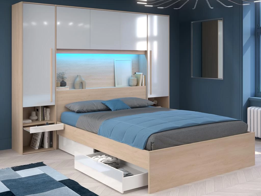 Le pont de lit VELONA se révèle être multifonctions. Ses tablettres coulissantes au niveau des niches vous permettront de créer une table de chevet de chaque côté du lit. De plus, VELONA est équipé de nombreuses étagères et d’une penderie afin de vous permettre de ranger vos vêtements à l’abris de la poussière. Le lit possède quant à lui 2 tiroirs sous sa structure afin de vous offrir un gain de place supplémentaire. Pour finir, le lit VELONA est équipé de LEDS, idéal pour créer une ambiance cocooning pour votre lecture du soir par exemple !