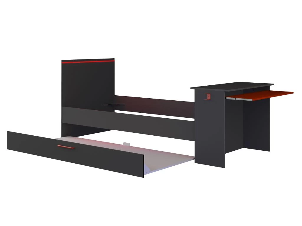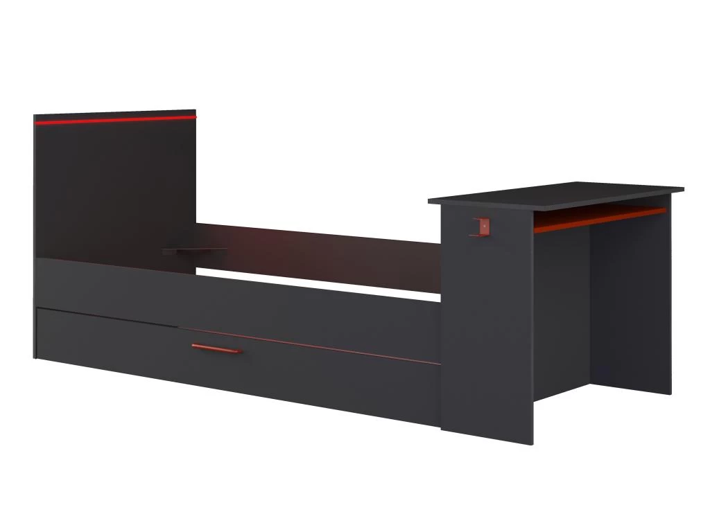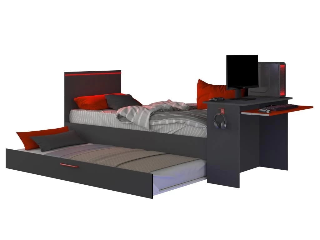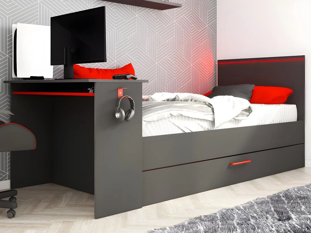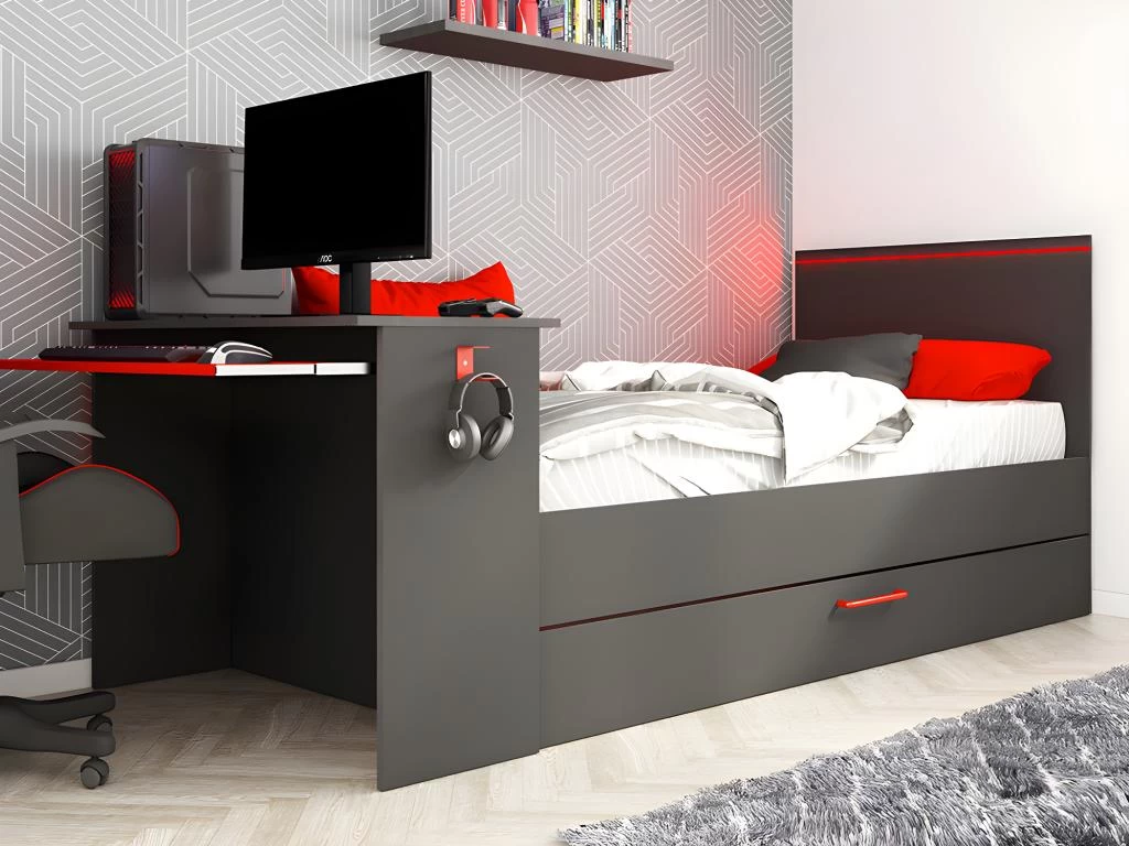 Le lit VOUANI dispose d’un bureau pour vous permettre de créer votre propre espace de jeu. Ce dernier est équipé d’une tablette pour disposer votre clavier mais également d’une accroche pour ranger votre casque. Les LEDs rouges installées sur ce lit viendront créer une ambiance gaming de professionnel dans votre chambre.