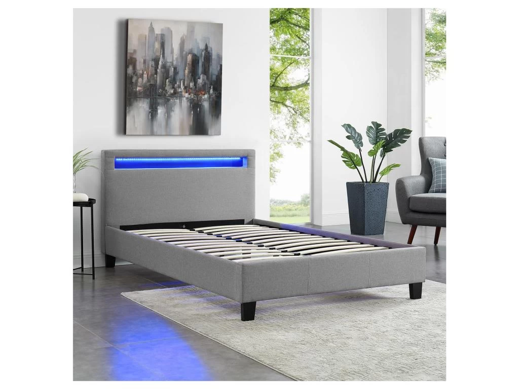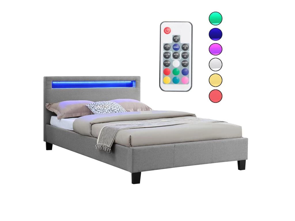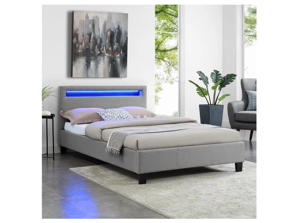 … apportera à coup sûr une touche de modernité dans votre chambre à coucher. Sa tête de lit rembourrée contient un éclairage LED, dont vous pourrez modifier à volonté la couleur et les effets de lumière selon vos envies. Le design élégant de ce lit est également marqué par son revêtement en tissu. La stabilité du lit est assurée par 4 pieds robustes et renforcée par la présence d’une traverse centrale et de 2 pieds de soutien supplémentaire sous le sommier à lattes, ce dernier est inclus dans la livraison.