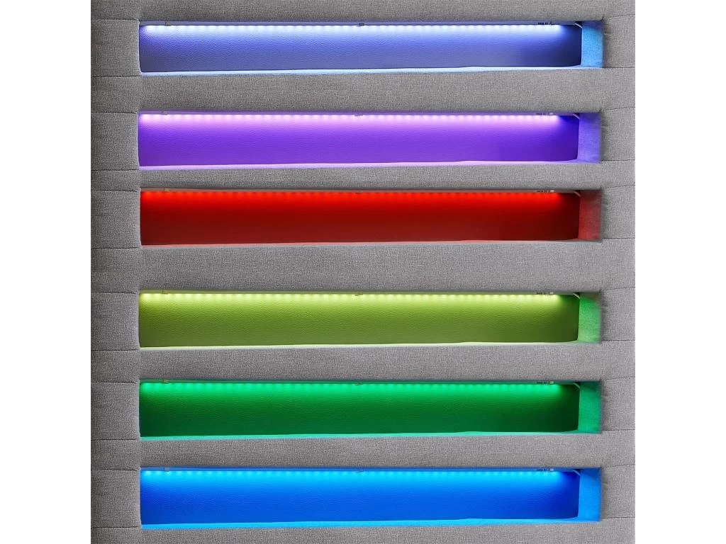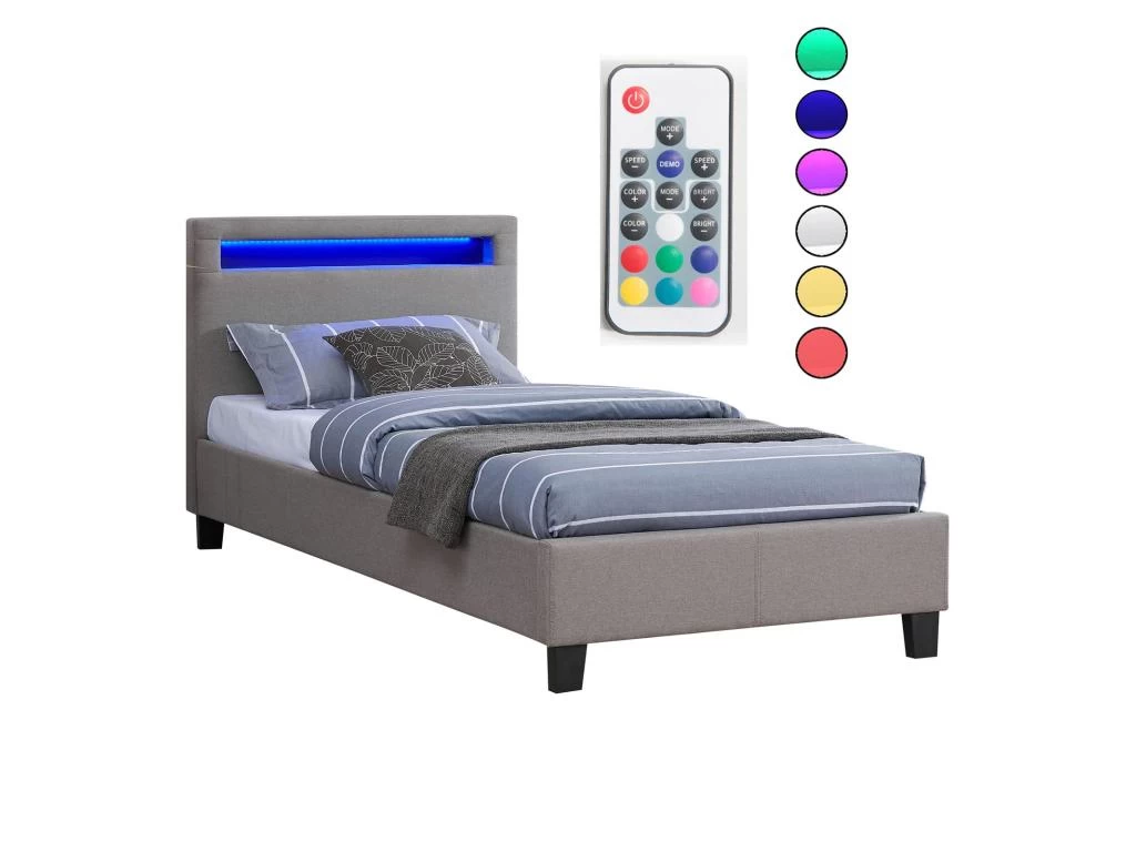 … apportera à coup sûr une touche de modernité dans votre chambre ou dans celle de votre enfant. Sa tête de lit rembourrée contient un éclairage LED, dont vous pourrez modifier à volonté la couleur et les effets de lumière selon vos envies. Le design élégant de ce lit est également marqué par son revêtement en synthétique. La stabilité du lit est assurée par 4 pieds robustes et renforcée par la présence d’une traverse centrale et de 2 pieds de soutien supplémentaire sous le sommier à lattes, ce dernier est inclus dans la livraison.