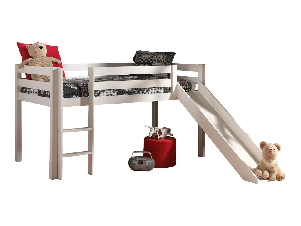 Lit Mezzanine 90×200 constitué de pin massif de couleur blanc laqué et comportant un toboggan, ce qui fera le bonheur de votre enfant. Il est prévu pour accueillir un couchage 90×200, le sommier à lattes est inclus en revanche le matelas est en option, vendu séparément. Grâce à sa hauteur, ce lit mezzanine permettra de faciliter le rangement de la chambre de votre enfant en plaçant en dessous de celui-ci ses coffres de rangement, ses caisses de jouet, … L’échelle permet à votre enfant d’accéder à la partie supérieure du lit. Elle est composée de 2 marches plates et ses arrêtes sont arrondies. Possibilité d’intervertir l’échelle et le toboggan. Dimensions totales du lit mezzanine : Longueur : 210 cm, Largeur : 106 cm (223 cm avec toboggan), Hauteur : 114 cm. Poids : 46 kg. Livré en kit.