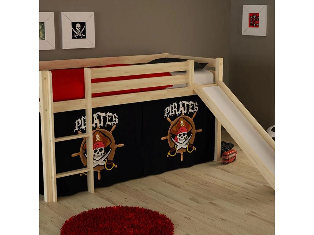 Lit Mezzanine 90×200 constitué de pin massif naturel et comportant un toboggan, ce qui fera le bonheur de votre enfant. Il est prévu pour accueillir un couchage 90×200, le sommier à lattes est inclus en revanche le matelas est en option, vendu séparément. Ce lit comporte des textiles sur le thème des pirates, une housse est disposée sous la partie couchage créant une cabane pour votre enfant. Grâce à sa hauteur, la partie cabane permettra de faciliter le rangement de la chambre de votre enfant en plaçant ses coffres de rangement, ses caisses de jouet, … Ou créer un espace détente et d’amusement pour votre enfant. L’échelle permet à votre enfant d’accéder à la partie supérieure du lit. Elle est composée de 2 marches plates et ses arrêtes sont arrondies. Possibilité d’intervertir l’échelle et le toboggan. Dimensions totales du lit mezzanine : Longueur : 210 cm, Largeur : 106 cm (223 cm avec toboggan), Hauteur : 114 cm. Poids : 47 kg. Livré en kit.