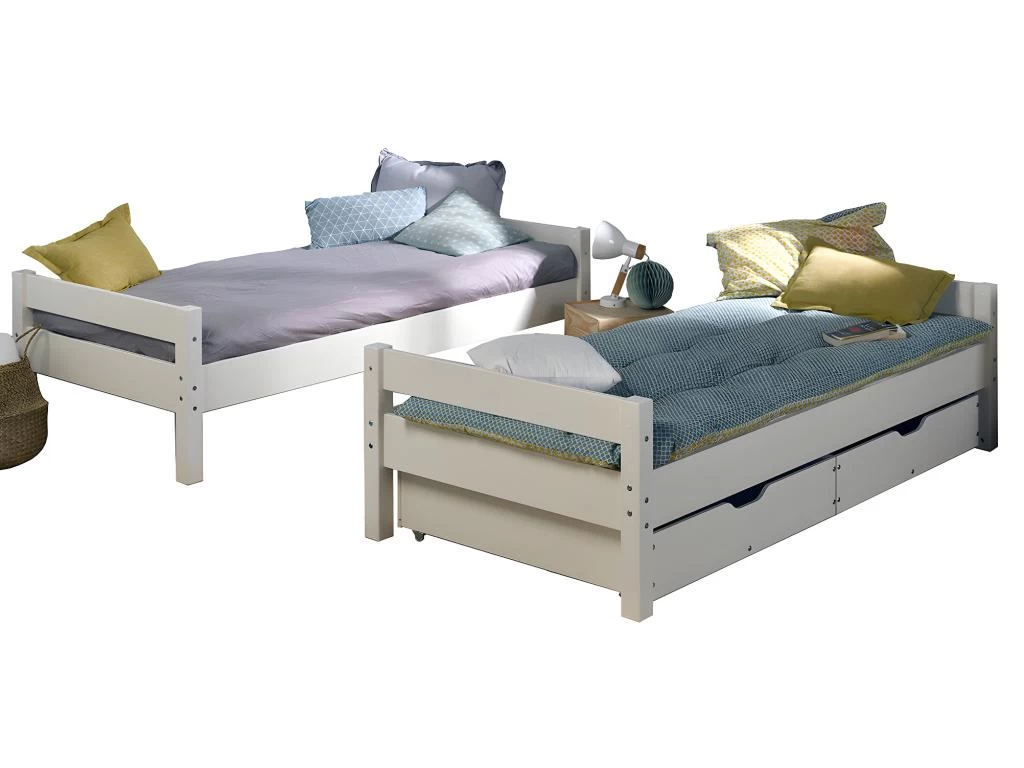 Lits superposés dissociables permettant une transformation simple, rapide, et au gré de vos besoins, en 2 lits simples ou lit simple et lit banquette. Comportant un ensemble de 2 tiroirs de rangement, ce lit se présente comme une véritable solution gain de place fonctionnelle ! Les sommiers à lattes en bois massif sont inclus.