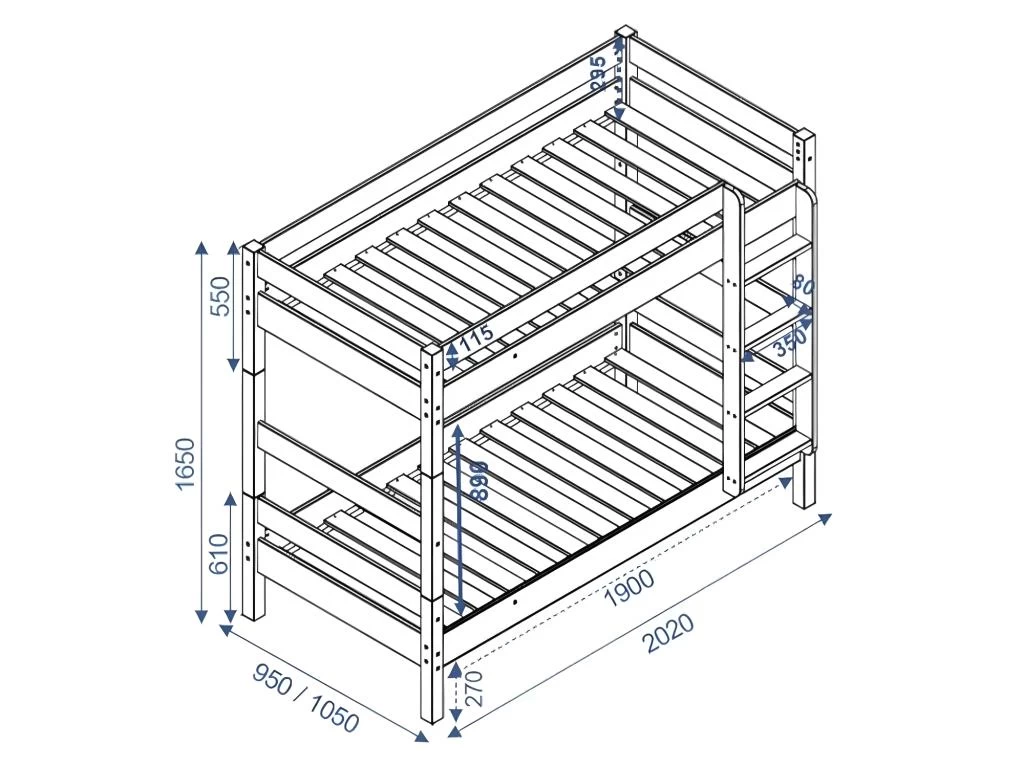 Lit 80×190 cm : Long. 2020 x larg. 950 x haut. 1650 mm