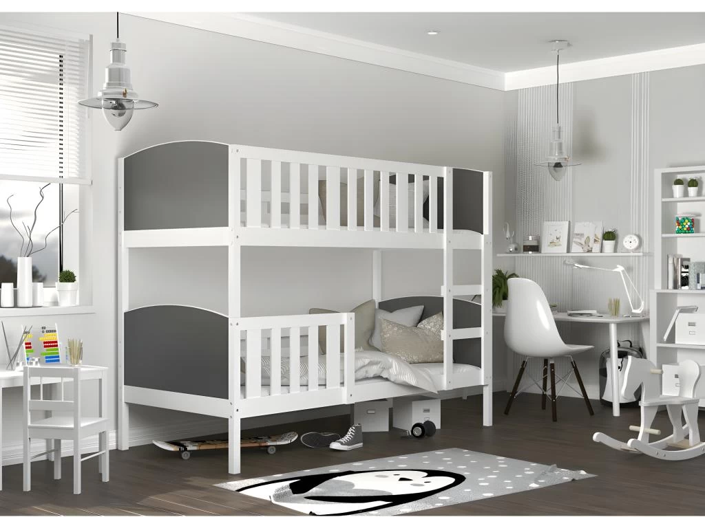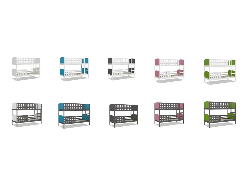 LIT SUPERPOSÉ TOM 90×190 livré avec 2 sommiers. Ce lit s’intègre parfaitement dans toutes les chambres d’enfant, grâce à un design simple et moderne. Ce lit superposé se distingue par ses jolies formes et des couleurs vives. Ce genre de lit convient aussi bien à un enfant, à partir de 3 ans, qu’à un adolescent, grâce à sa barrière de sécurité supplémentaire qui protège des chutes de jeunes enfants. Le meuble en BOIS et MDF lui garantit une bonne durée de vie. Modulable : séparable en deux lits indépendants et une échelle positionnable à gauche ou à droite. Nos lits sont fournis dans les colis en carton, en pièces détachées pour l’auto-assemblage. Attention les matelas ne sont pas fournis avec le lit.