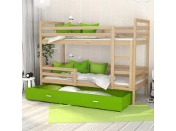 Lit Superposé 3 Places Milo 90×190 Pin – Vert Livré Avec Sommiers, Tiroir Et Matelas En Mousse De 7cm