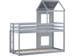 Lit Superposé Cabane En Forme De Maison Avec Deux Fenêtres – 90x200cm – Pin Maddif – Gris