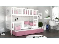 Lit Superposé 3 Places Milo 90×190 Blanc – Rose Livré Avec Sommiers, Tiroir Et Matelas En Mousse De 7cm