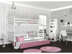 Lit Superposé 3 Places Teo 90×190 Blanc – Rose Livré Avec Sommiers, Tiroir Et Matelas En Mousse De 7cm