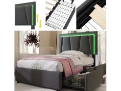 Lit 90x200cm Avec 2 Tiroirs + LED + Sommier Ă Lattes – Lin – Gris