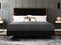 Lit 160 X 200 Cm Avec Tête De Lit Coutures Verticales – Velours – Noir Et Doré – CLARISSE