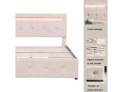 Lit Rembourré En Lin Avec Led Et 4 Tiroirs + Sommier à Lattes – 140x200cm – Beige