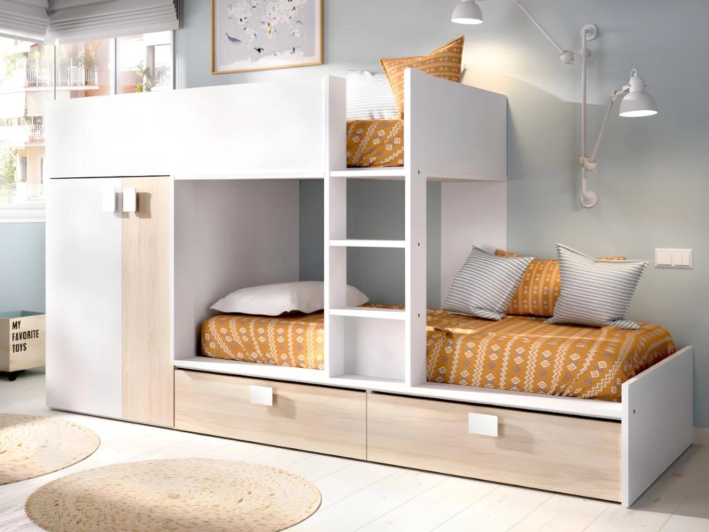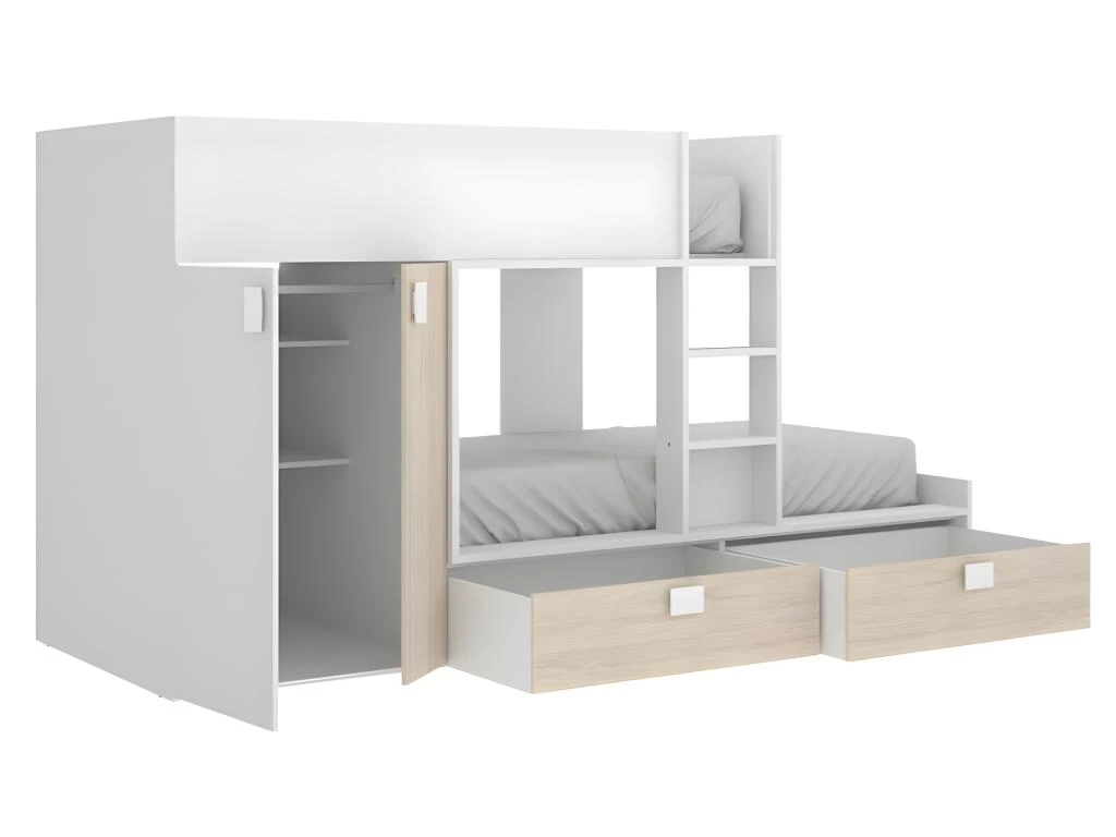 Libérer de la place dans la chambre de vos enfants grâce aux lits superposés JUANITO. Son armoire et ses 2 grands tiroirs vous permettront de ranger l’ensemble de leurs affaires.