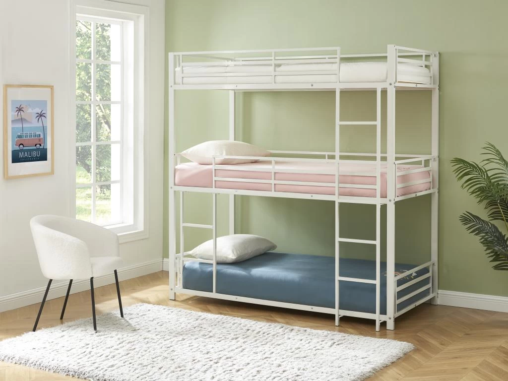 Craquez pour ces 3 magnifiques lits superposés en métal. Sobres et pratiques, ils vous feront gagner de la place et conviendront parfaitement aux espaces réduits !
