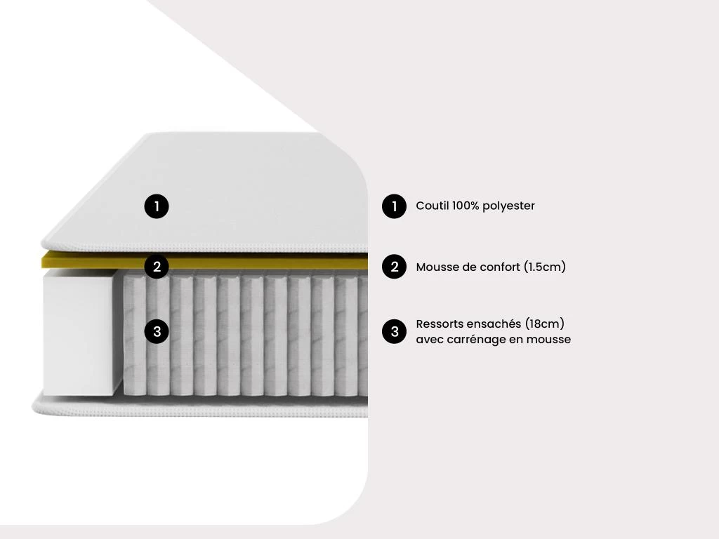 Technique de pointe en matière de ressorts; chaque ressort est emballé dans une enveloppe fermée lui permettant de bouger individuellement et offrant ainsi un soutien point par point très précis et une excellente indépendance de couchage