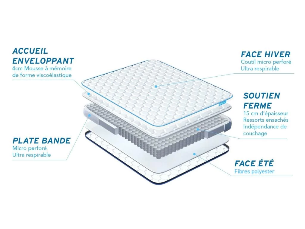 Maxi-Epaisseur/Aéré//Confort Visco/Ergonomique/Face été-Face Hiver/Mousse à mémoire de forme/Allègement des points de pression/Fabriqué en Europe/Indépendance de couchage
