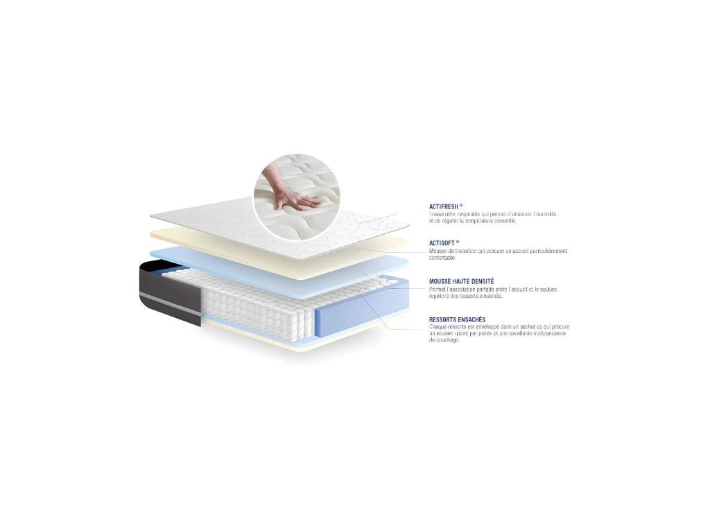 L’avis de notre expert: le modèle Actiflex TOUCH bénéficie d’un confort équilibré. Ce matelas hybride doté de 3 zones de confort est composé de 2 technologies : mousse Actisoft et ressorts ensachés. Cette association de technologies permet de bénéficier d’un soutien morphologique très précis et d’une parfaite indépendance de couchage. Elle vous assure donc une totale liberté de mouvement.
