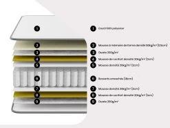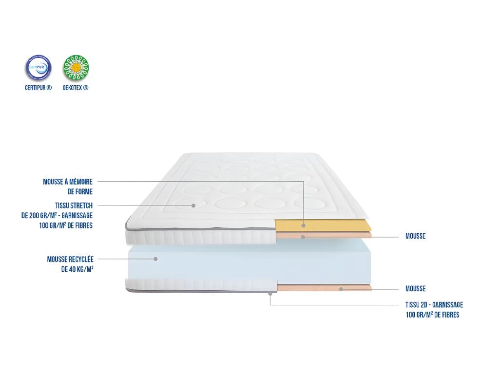 - Âme intérieure du matelas (certifiée CertiPUR) : 15,5 cm de mousse recyclée de 40 kg/m³
