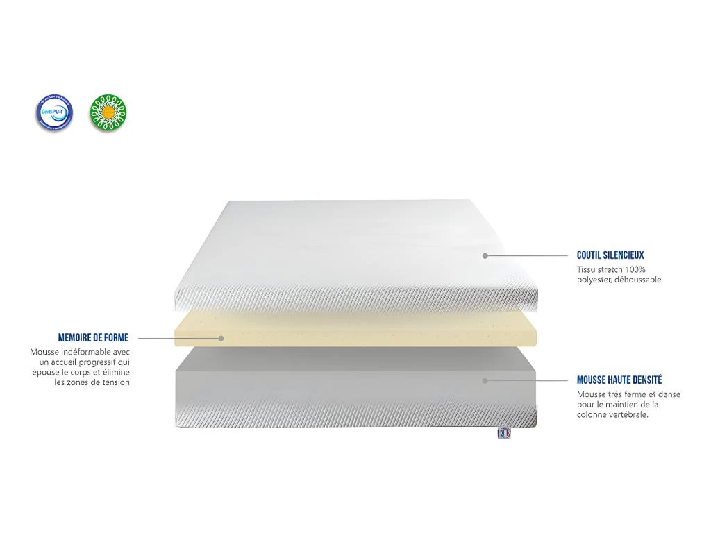 - Âme intérieure du matelas (certifiée CertiPUR) : 18 cm de mousse Haute Densité de 28 kg/m³ + 3 cm de mousse viscoélastique à mémoire de forme de 50 kg/m³