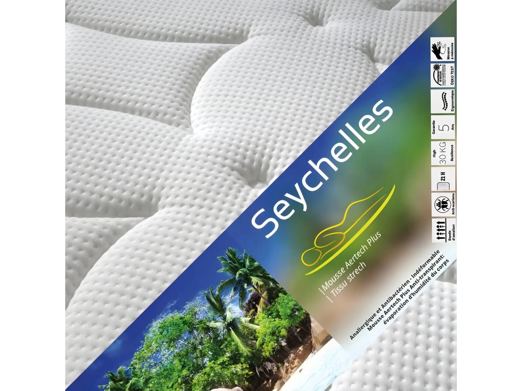 Matelas Seychelles : Mousse Aertech plus H:13,5 cm, densité 30 Kg/m3, Mousse à Mémoire H:5 cm, densité 43 Kg/m3, Housse supérieure et inférieure matelassée fixe composée de Tissu Stretch anti-acariens et hypoallergénique 100% polyester 180 g/m2, Rembourrage Thermoflex B 450 g/m2 (60% Coton, 40% polyester) et Bordage périmetral matelassé avec 4 poignées et bande aéeré 3D. Confort : Soutien ferme, accueil confortable – Hauteur 21 cm – GARANTIE 5 ANS.