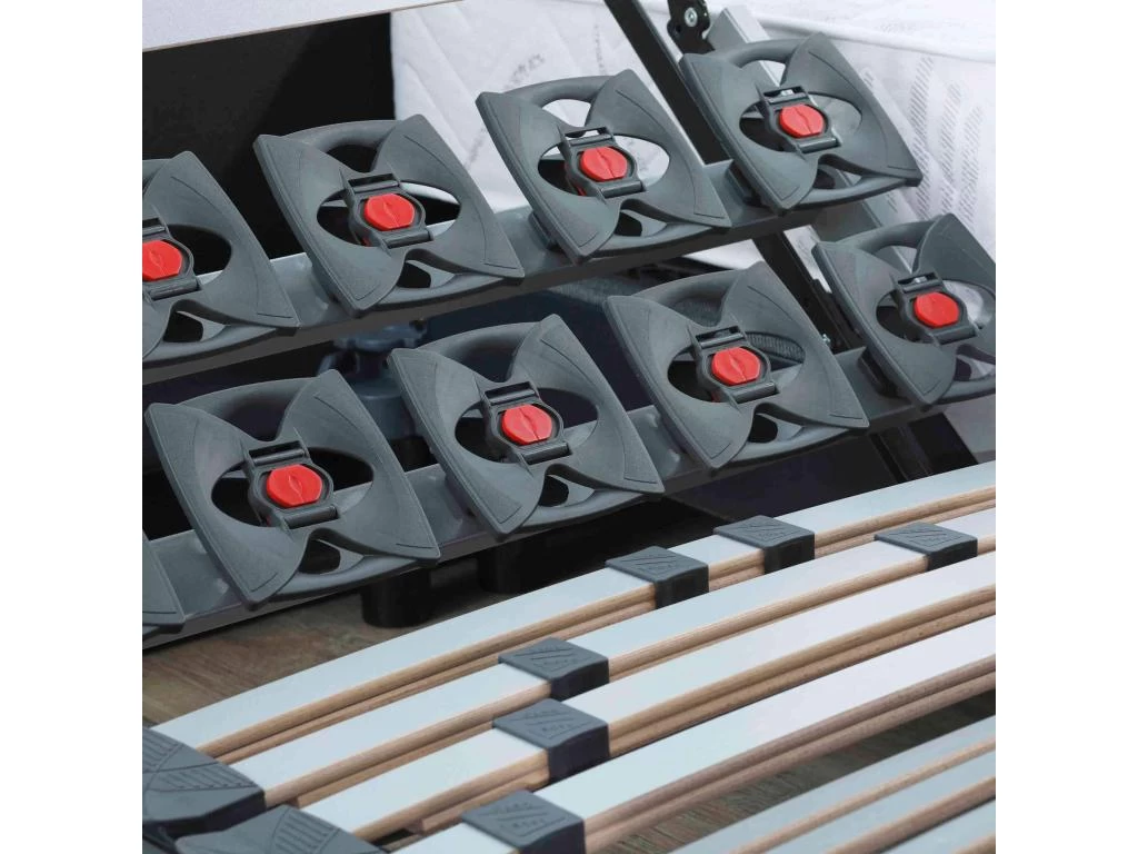 – Suspension : 20 lattes multiplis dont 4 avec curseurs permettant de régler la fermeté sur la zone lombaire ainsi que 2 rangées de 5 plots multidirectionnels