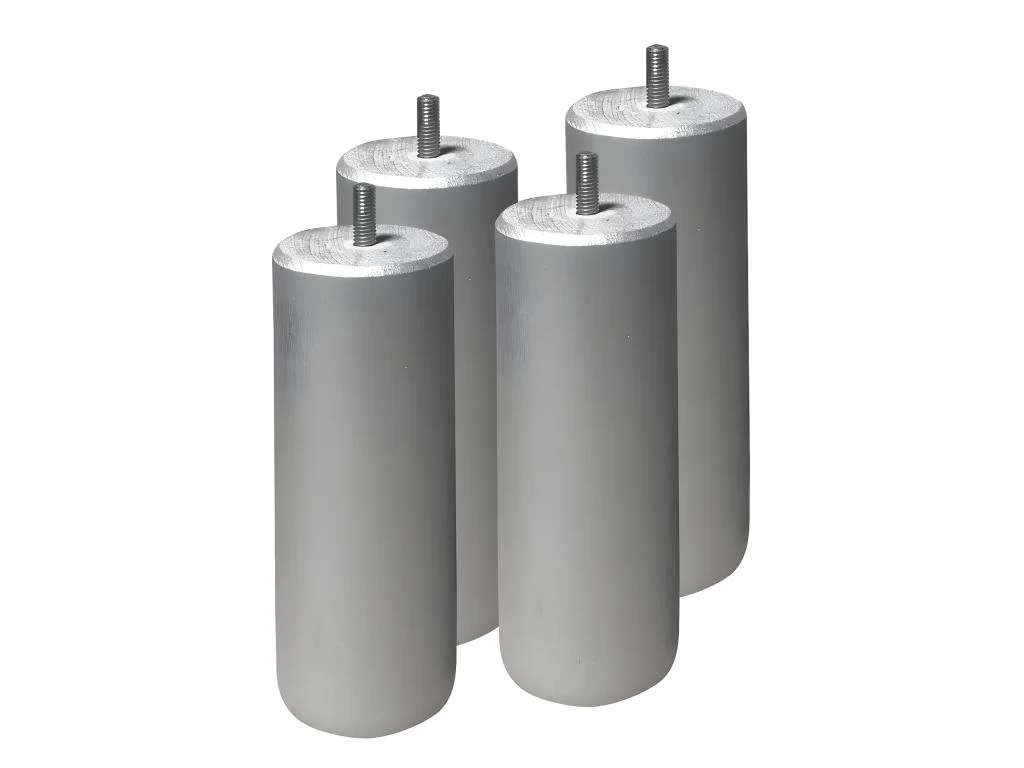 Pieds : Jeu de 4 pieds en hêtre massif teinté argent pour sommier tapissier. Hauteur : 15 cm. Diamètre Pied : 6 cm. Diamètre tige filetée : 8 mm.
